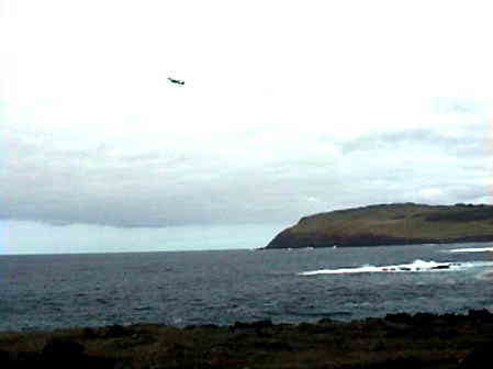 島の南西端ヴィナプから見た離陸後の飛行機。小さく見えるのがパペーテ行き、ランチリ834便のボーイング767-300ER。このマタヴェリ空港の滑走路はなんと3300mある。大型旅客機も発着可能な長さはあまりにも不必要じゃないかと思えるのだが、実はこれ、アメリカのNASAがスペースシャトルの緊急着陸用にUS$15.000.000もかけて造成したもの。実際に使用する可能性はあまりにも低く、「こんなところにカネかけて、NASAはアホだな」と思うが、確かにこの近く数千キロ以内に着陸できる場所となるとここしかないのでそれなりの選択かもと思う。