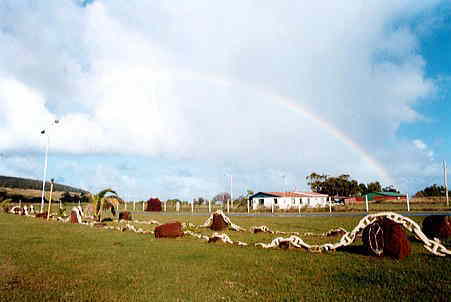 駐車場の奥には、船の錨をあしらったオブジェがおかれていた。そして空には180度見渡せる美しい虹が。6月から8月は雨期で雨が降るときもあるがすぐに晴れて大きなきれいな虹があちらこちらで見られる。