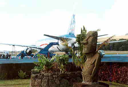 外交折衝をして数ヶ月に一度のチリ海軍の軍艦に乗せてもらわない限り、イースター島に行く唯一の方法が飛行機。それもチリ国営のランチリ航空に乗るしかない。サンチアゴ−イースター−パペーテをピストン運行しているため、観光シーズンオフには週2便。冬の観光シーズンにも週3便しか飛行機が飛ばないことになる。