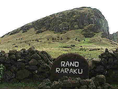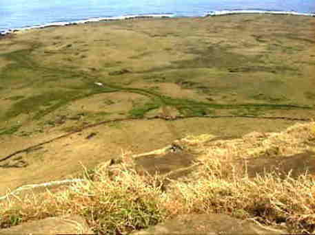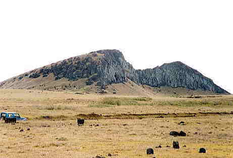 地図で言う「入り口」方向から見たラノララクの全体像。これを撮ったのは「アフ アカハンガ」。背後は海である。この山はモアイを切り出しすぎて山の形が変わってしまったという。真ん中あたりのへっこんでいるところがそうなのか、ちょっと不明。分かりにくいが、山の麓に黒くポツポツしているのが全てモアイである。