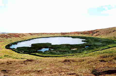 ラノララクの中心には湖がある、というよりも「ラノ」というのはラパヌイ語で湖のことなので、正式に言うとラノララクとはこの湖を指す。島にはラノカウ、ラノアロイ、そしてここと3つの湖があるが、ここが一番湖らしい湖。面積の1/3を葦の一種、トトラが覆っている。