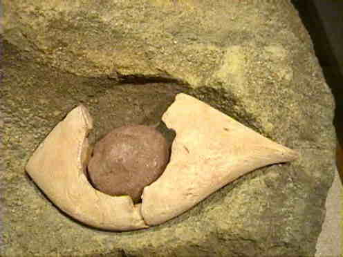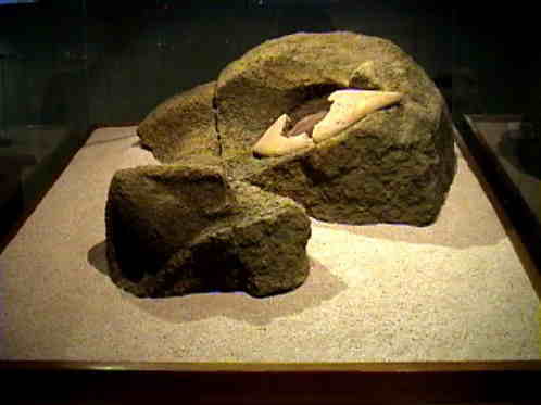 これが世界でここにしかない、大変貴重なモアイの目である。よく海外の「○○展」などに運ばれていくため、展示してないときも多いらしい。幅35cm、高さ15cm、厚さ6cmの白色の珊瑚の中に、赤色凝灰岩が埋め込まれている。本来は瞳に黒色の黒曜石も使われていたらしい。この目は1978年2月、アフナウナウの発掘をしていた島の考古学者、セルジオ・ラプ氏よって偶然発見されたものである。なぜそれまで目が発見されなかったかというと、目はマナ(超自然力)が宿る場所と考えられており、フリモアイ(モアイ倒し戦争)の時、一番最初に破壊されたのではないか、と考えられている。