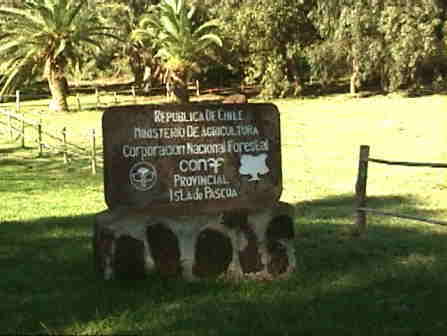 マタヴェリにある「ここはラパヌイ国立公園だよ」という標識。ハンガロアの村からオロンゴに向かおうとする坂道の始まりにこれがある。おそらくかつての鳥人儀礼の時、首長達が準備のための村を作ったのがここらへんだと思われる。