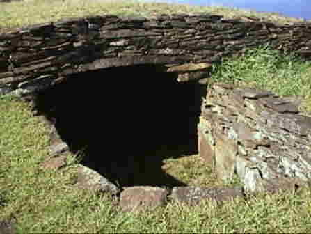 岩屋の入り口は大変低い。入り口にかかる長方形の石には彫刻が施され、部屋の中にもマケマケ神をあらわす絵が彫られたという。またそれぞれの家の前には調理用のかまどがあったという。