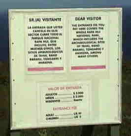 大人はUS$10(チリペソ$5000)、子どもはUS$5の入場料を取る。ちょっと高すぎないかい?と思うが、看板には「観光客のみなさんへ ここで払っていただいた入場料はオロンゴだけでなく、タハイ、ラノララク、トンガリキ、アナケナなどイースター島全ての遺跡の入場料を含みます」てなことが書いてある。この島で見かけるほとんどの看板はスペイン語またはラパヌイ語だが、「どーしても読んで欲しい事」だけは英語で書いてある。たいてい「○×は禁止」「○×に注意しろ」といった場合のみ。もっとも、近くにいる誰かに話しかけると英語で説明してくれることも多い。若い姉ちゃん、兄ちゃんには英語が通じることが多く会話が弾んでしまう。